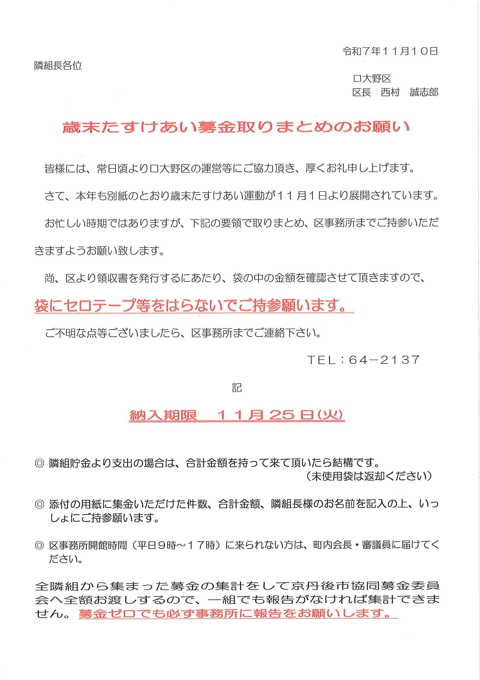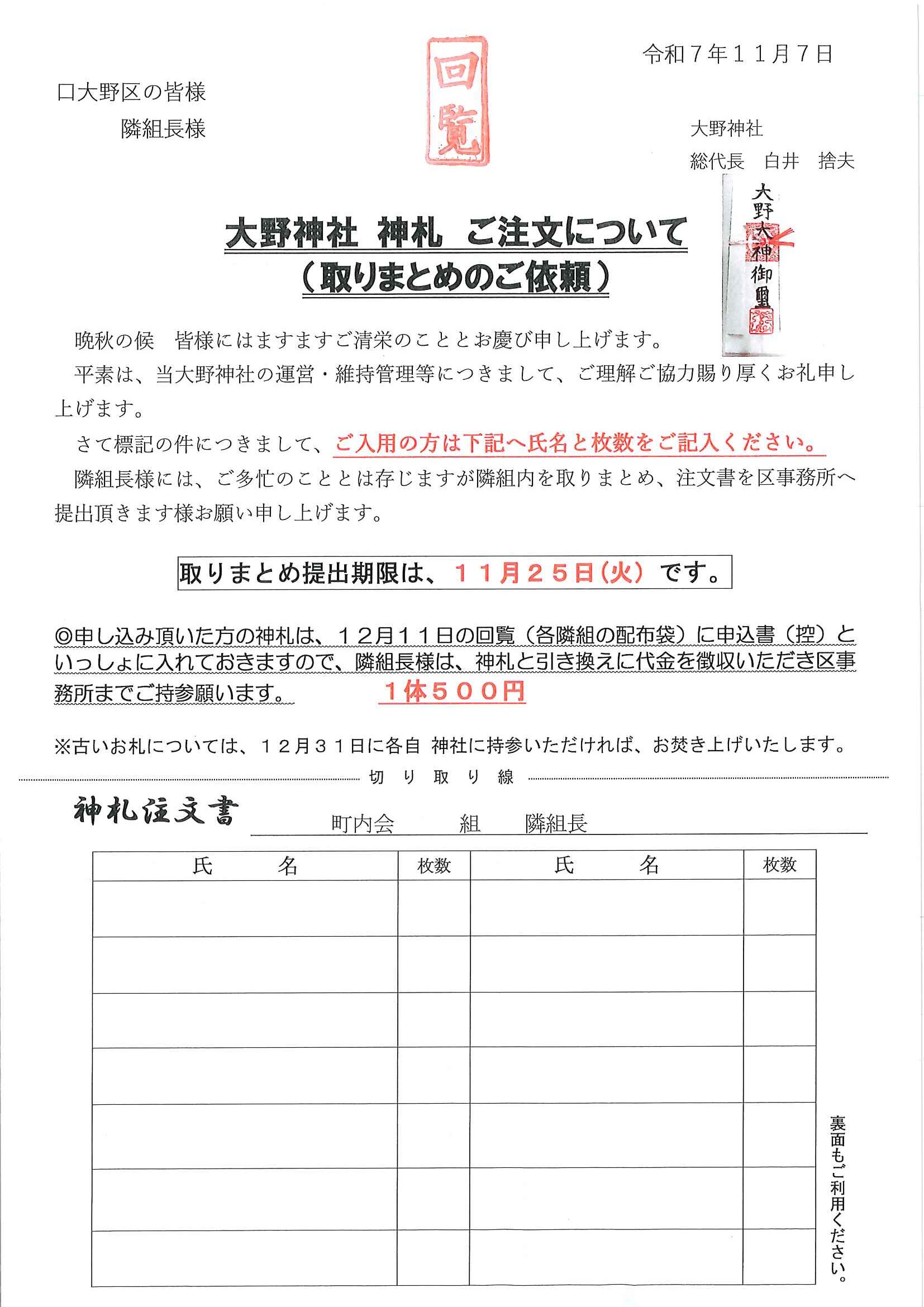 <隣組長様宛て>・歳末たすけあい募金とりまとめについて ・大野神社神札の注文 回覧版は読み終えたらすぐにお隣さんへ! 次回配布は11月26日の予定です