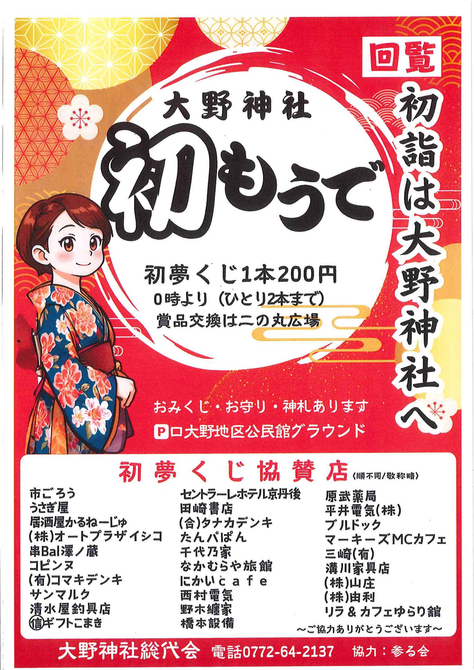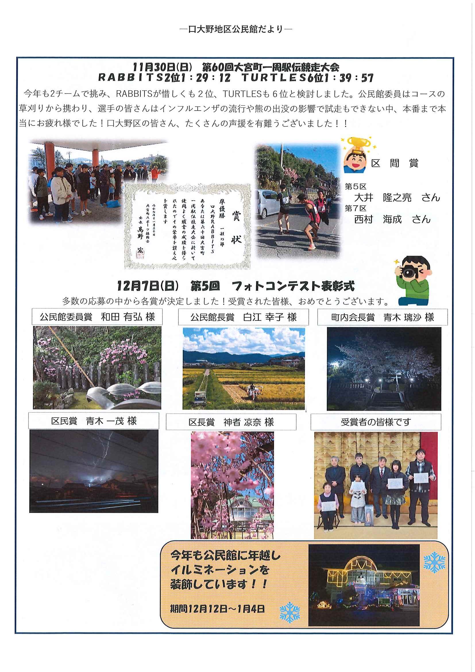 ・初詣は大野神社へ ・にこにこサロン(1月) ・口大野地域公民館だより 裏面 ・おうちでラクラク スマホ申告を 裏面 ・日米交流ビーチボールバレー大会 ・京丹後デジタルポイント商品券購入上限拡大 裏面 ・地域おこしラジオ丹後を語る番組放送中 ・下水道工事予定表12/25- ・一小の子 裏面 ・大宮市民局NEWSおおみやトピックス