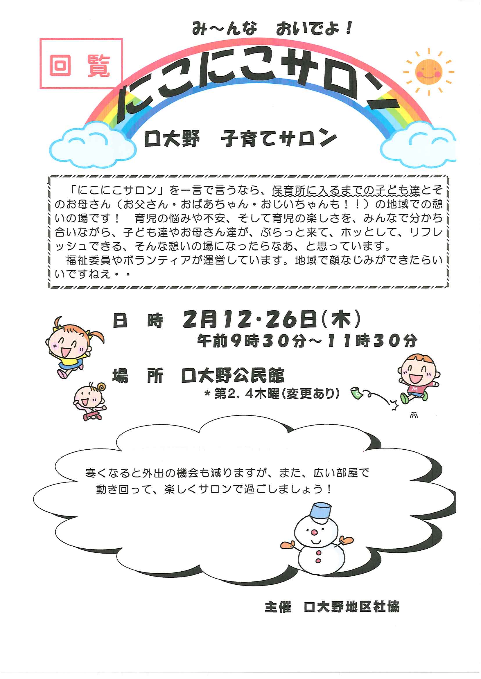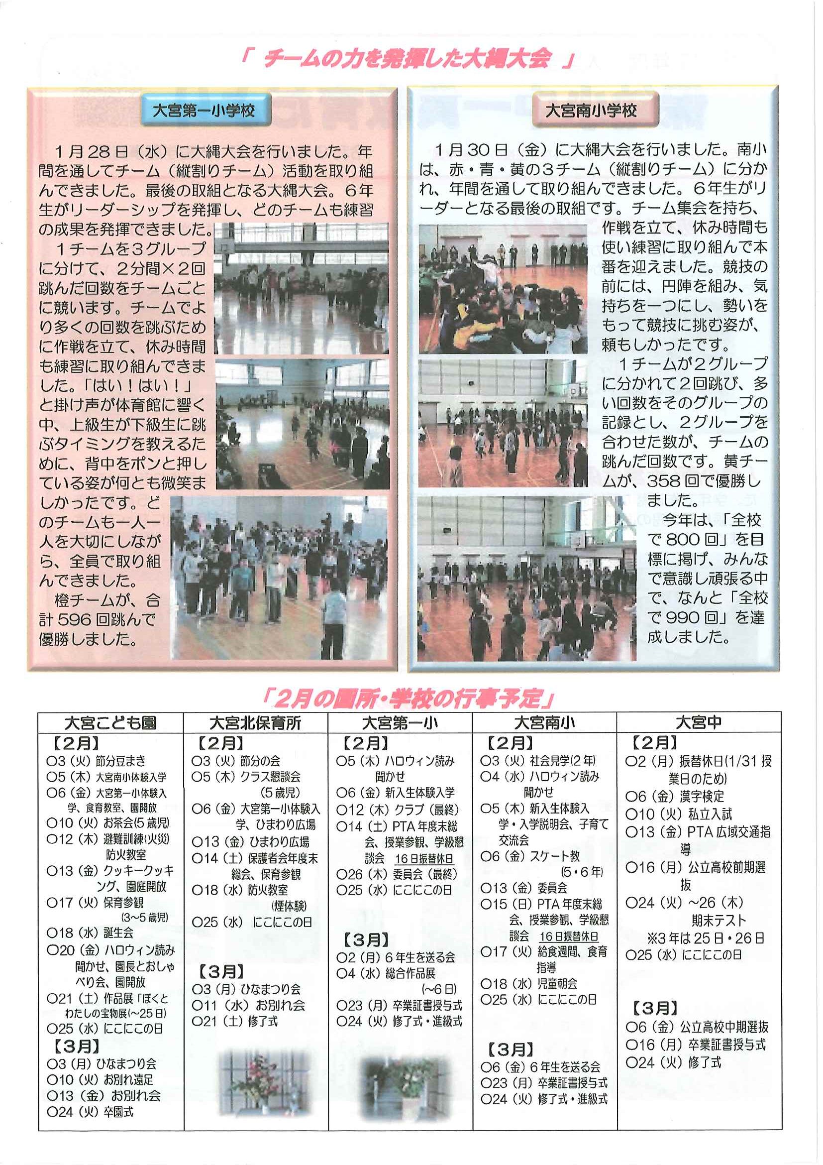 ・2月のふれあいサロン ・日米交流音楽会 ・大宮駐在所ミニ広報紙大宮パトロール2月号 ・保幼小中一貫教育だより2月号 裏面 ・大宮中学校だより第12号 裏面 ・一小の子2月号 裏面 ・きたほいくしょだより2月号 ・大宮市民局NEWSおおみやトピックス