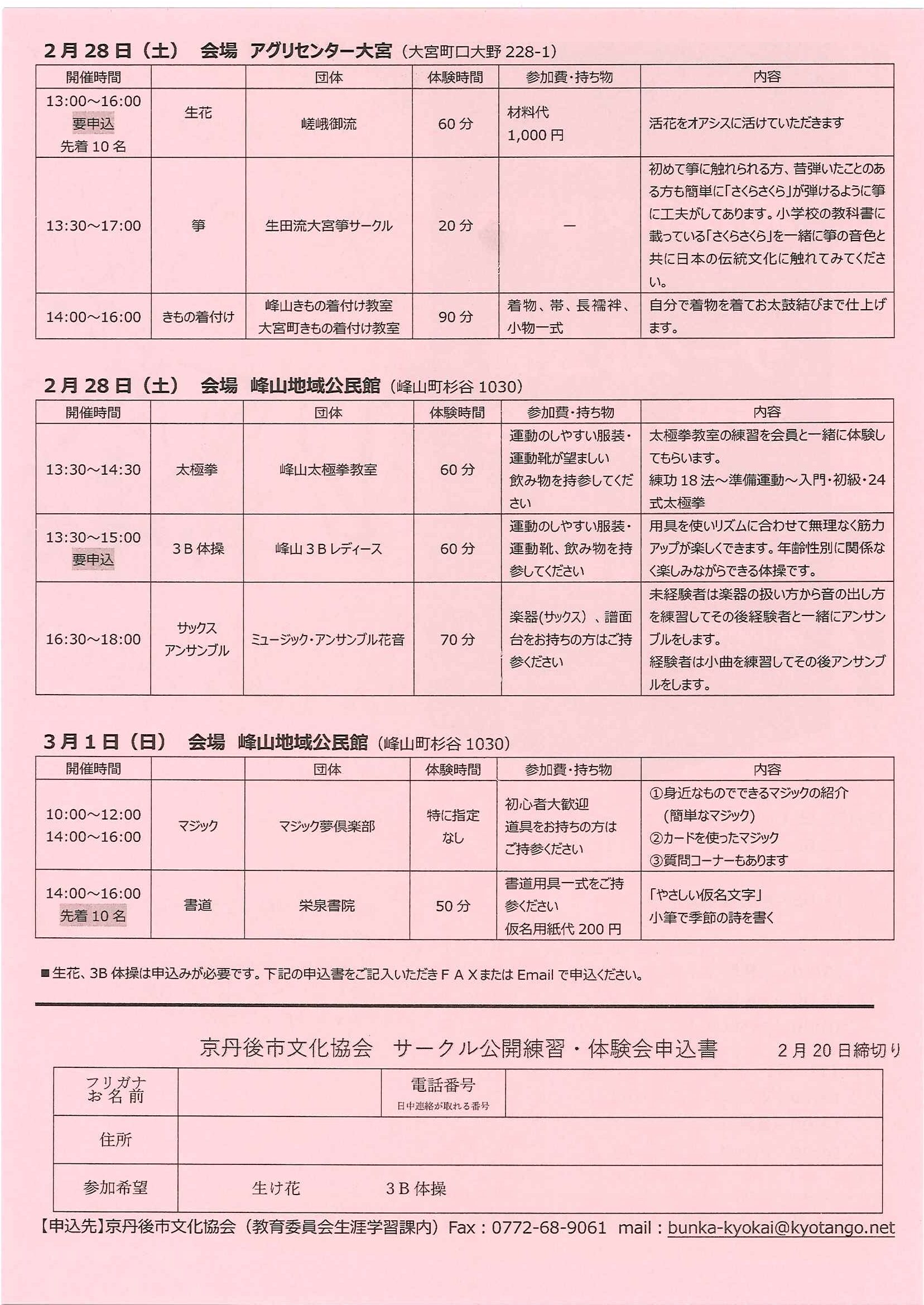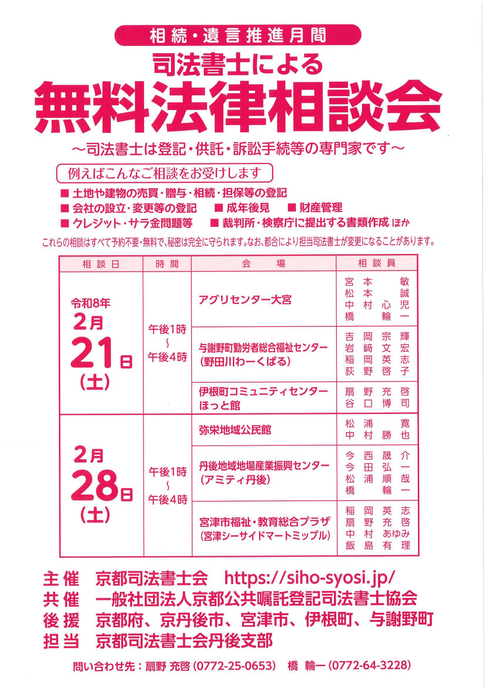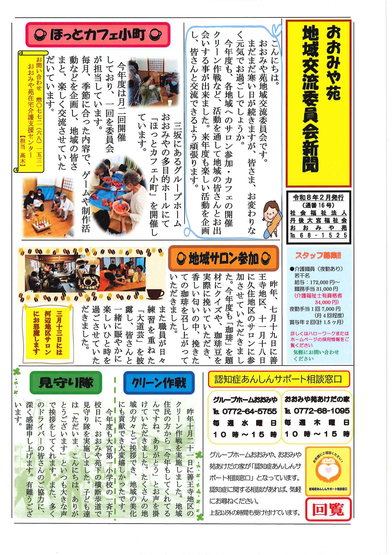 <2月26日> ・広報京丹後3月 ・大宮町民生委員・児童委員さんを紹介します P2 P3 P4 ・令和8年度職業訓練講座(夜間)ガイド P2 P3 P4 ・大宮地域公民館だより第108号 裏面 ・国際女性の日記念男女共同参画セミナー 裏面 ・きょうたんごローカルマッチングフェア京都ジョブ博 裏面 ・京丹後市健康づくり推進員募集 裏面 ・令和8年度から令和10年度口大野区費について 裏面 ・大野神社祈年祭 ・3月にこにこサロン(子育てサロン) ・峯山海軍航空隊歴史探訪ノルディックウォーキング参加者募集 ・気軽に始める体操公開講座 裏面 ・おおみや苑地域交流委員会新聞 ・下水道工事予定表2/25- 回覧版は読み終えたらすぐにお隣さんへ! 次回配布は3月11日の予定です <2月12日> ・京丹後市議会だより ・京丹後市農業委員会だより ・つながる絆フェス 裏面 ・司法書士による無料法律相談会 ・京丹後市医療確保奨学金看護師等修学資金 ・社会を明るくする運動優秀標語ステッカー