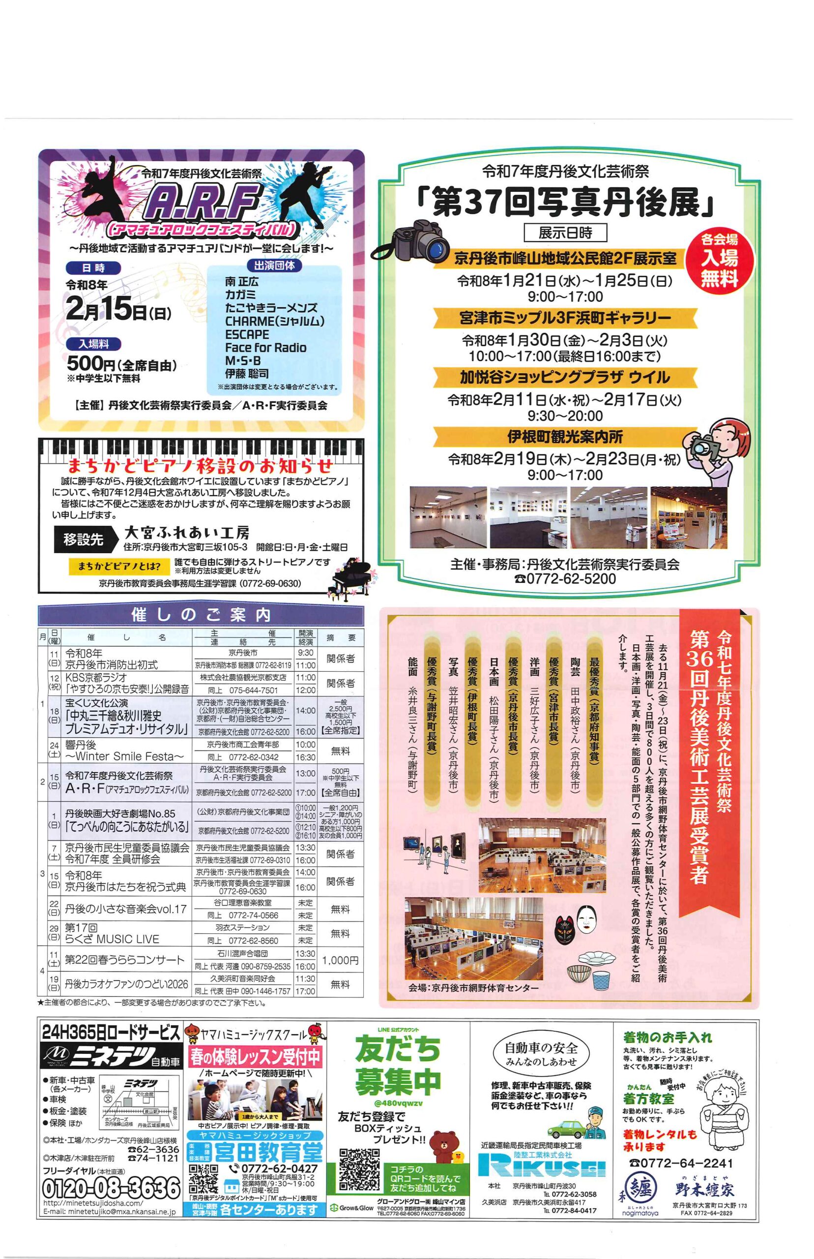 ・丹後震災100回忌事業 ・2月ふれあいサロン ・令和7年分確定申告は自宅から ・大宮駐在所ミニ広報紙大宮パトロール2月 ・保幼小中一貫教育だより2/6 裏面 ・大中だより第12号 裏面 ・一小の子2/2 裏面 ・きたほいくしょだより 回覧版は読み終えたらすぐにお隣さんへ! 次回配布は2月26日の予定です <1月26日> ・広報京丹後2月号 ・確定申告特集保存版 2面 3面 4面 ・サークル公開、練習、体験会 裏面 ・市民と議会の懇談会参加者募集