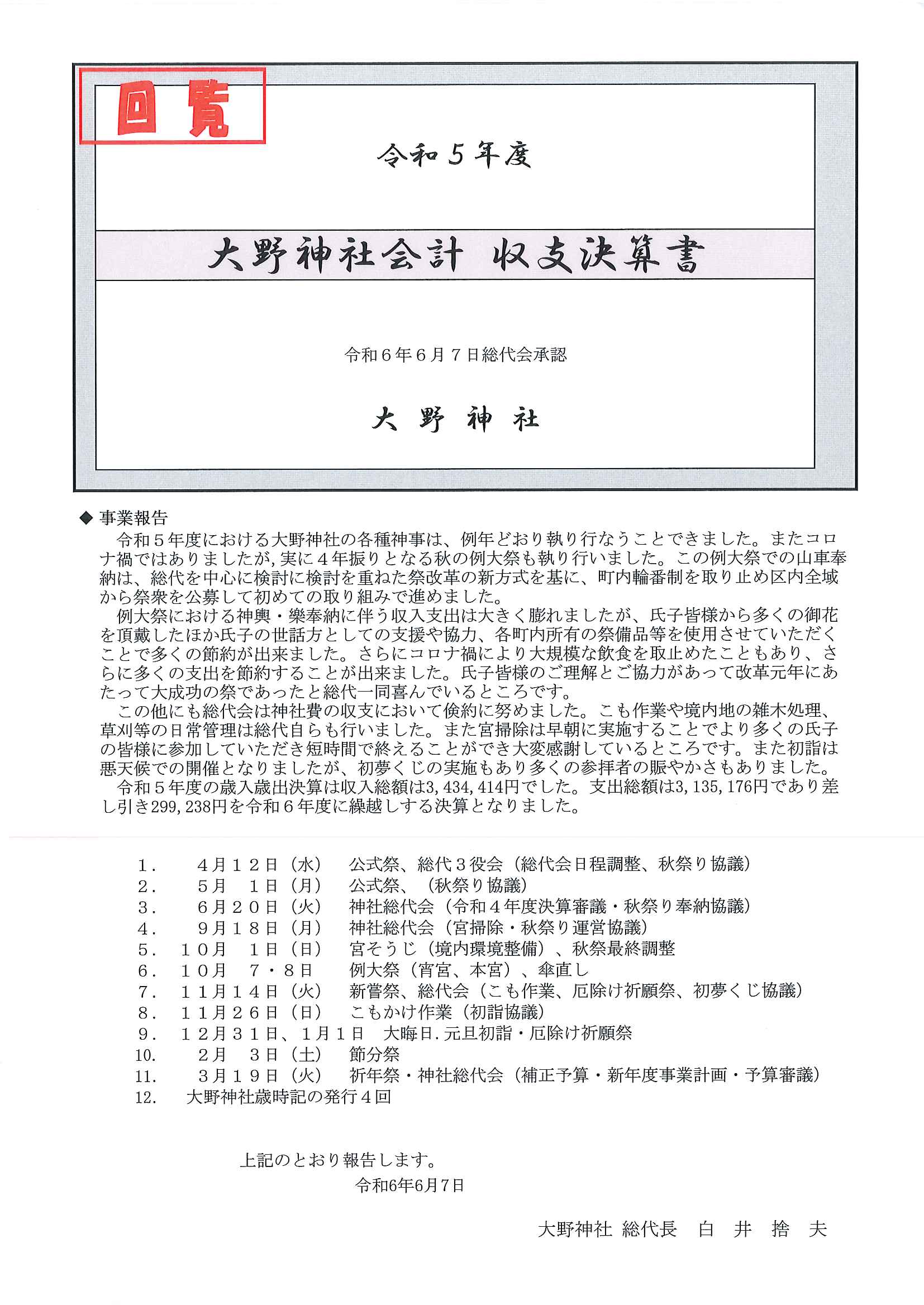 ◇◇ 令和5年度大野神社会計収支決算書 ◇◇
