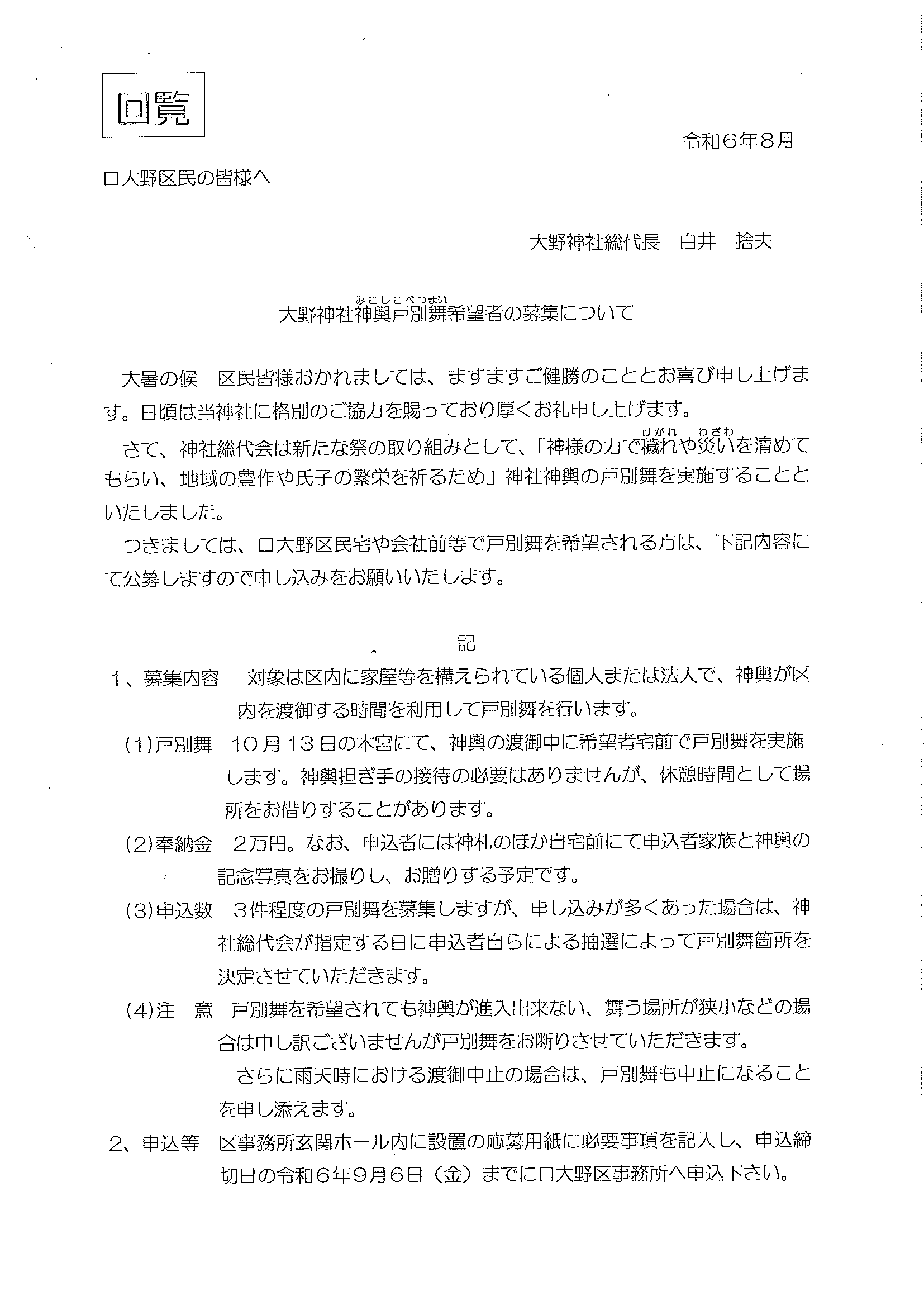 ◇◇ 令和6年神輿戸別舞希望者の募集 ◇◇